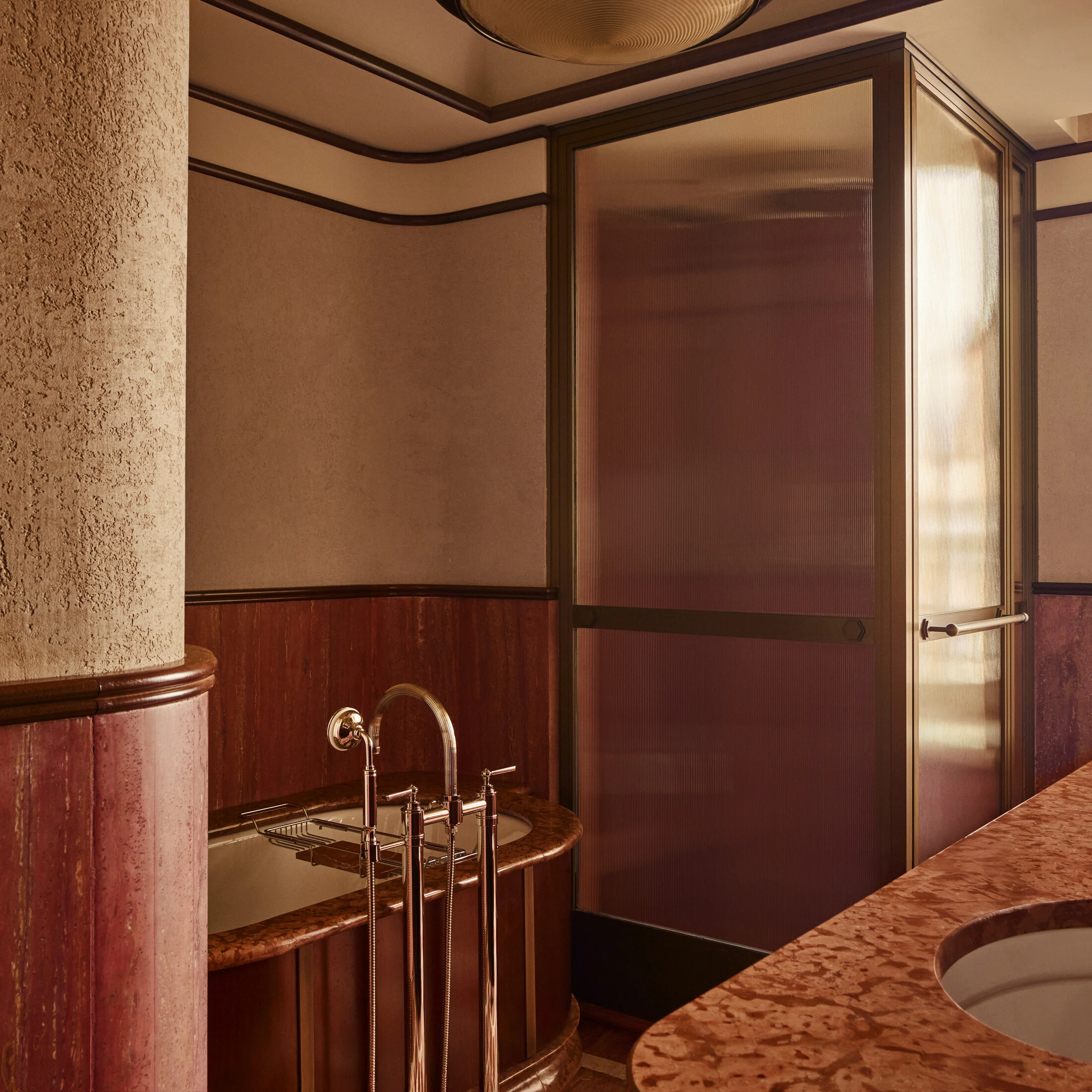 - Rosso Verona marble bathroom with Walk-in shower and bathtub