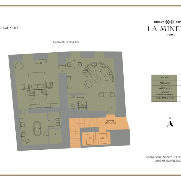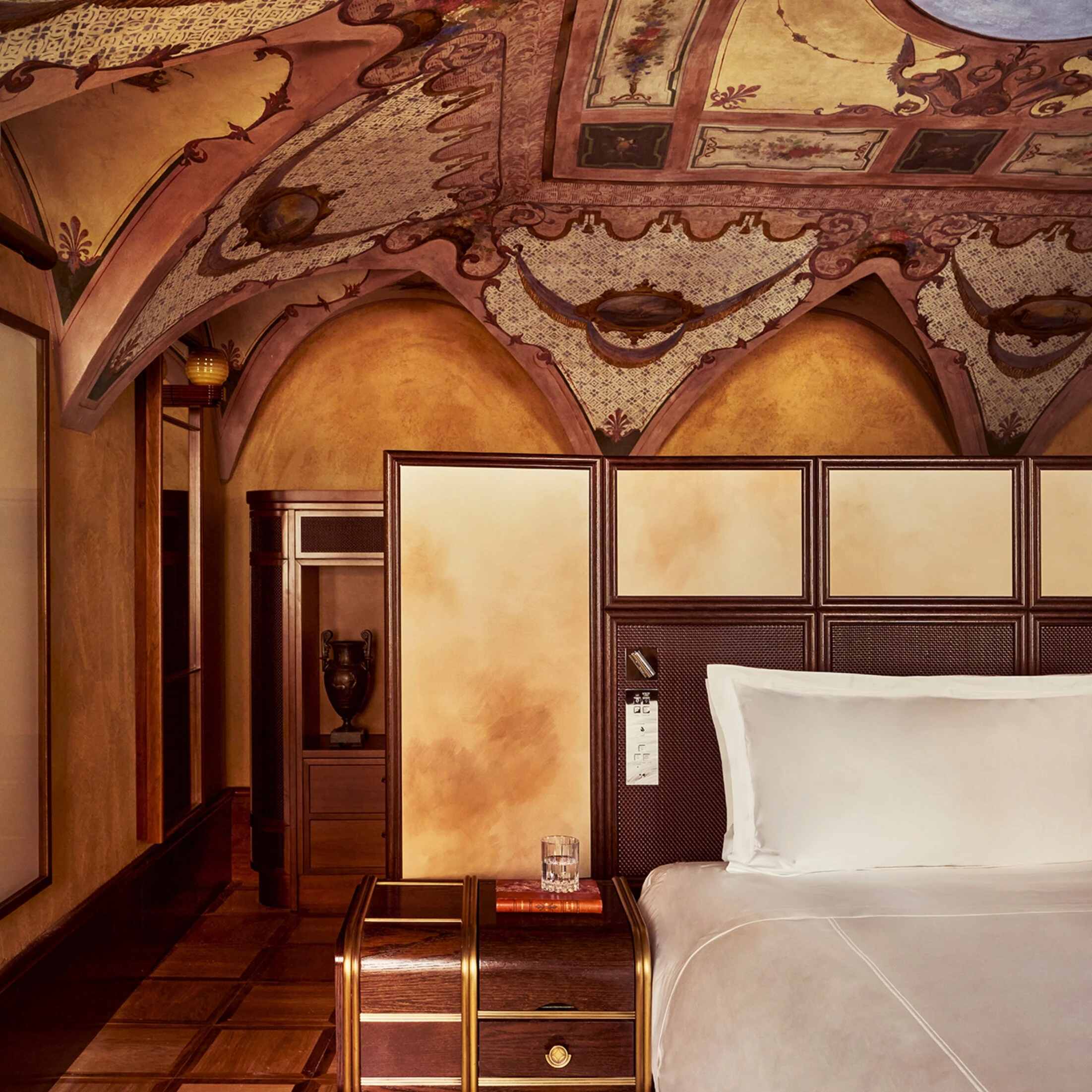 In honour of Stendhal, notable guest of the hotel, features fresco ceiling with views of the Pantheon and Minerva Square. Elegant living room, vanity desk and powder room. Rosso Verona marble bathroom with double sink, walk in shower and bathtub, and Honor Private Bar.